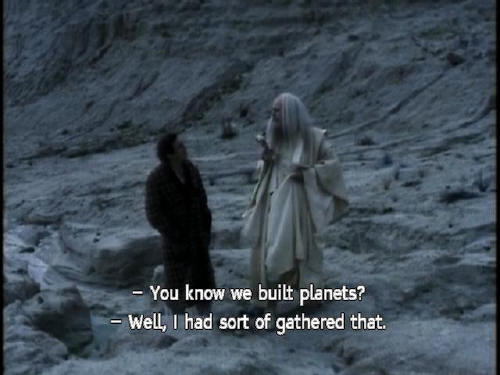 [Slartibartfast] Five million years ago, the Galactic economy collapsed, [Slartibartfast] and seeing that custom-built planets are something of a luxury commodity ... [Slartibartfast] You know we built planets? [Arthur] Well, I had sort of gathered that. [Slartibartfast] Fascinating trade. Doing the coastlines are always my favourite ... |