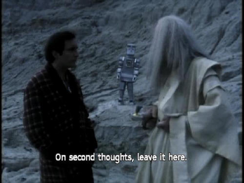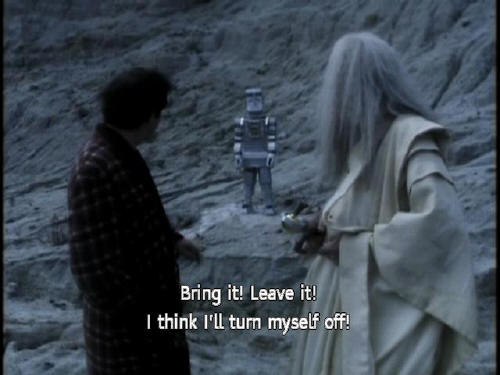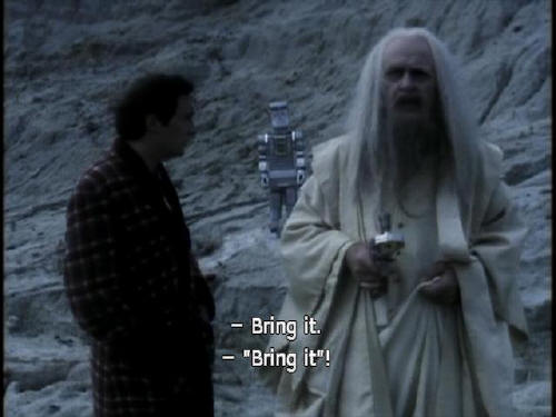 [Arthur] If you'd call it a robot -- it's more like an electronic sulking machine. [Slartibartfast] Bring it. [Marvin] "Bring it"! [Slartibartfast] On second thoughts, leave it here. [Marvin] Bring it! Leave it! I think I'll turn myself off! |