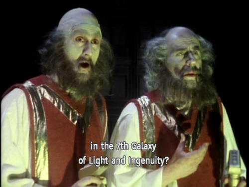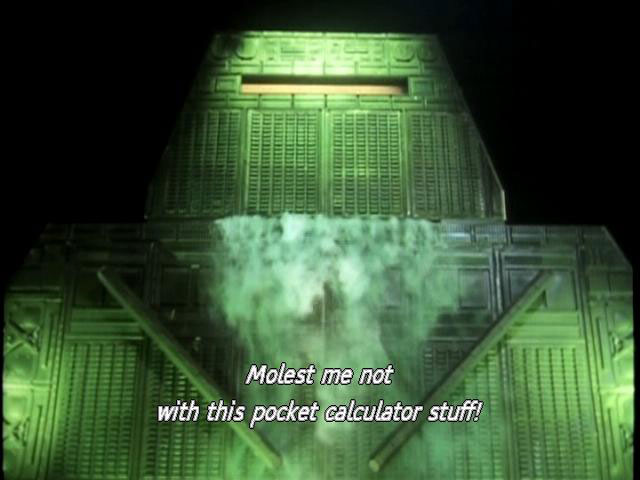[Priest 1] in the 7th Galaxy of Light and Ingenuity? [Computer] The Googleplex Star Thinker? [Computer] Molest me not with this pocket calculator stuff! [Priest 2] But are you not a more fiendish disputant [Priest 2] than the Great Hyperlobic Omnicognate Neutron Wrangler on Ciceronicus 12?! |