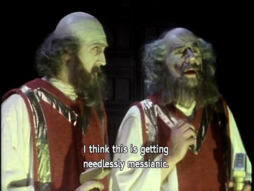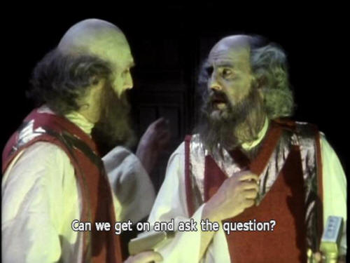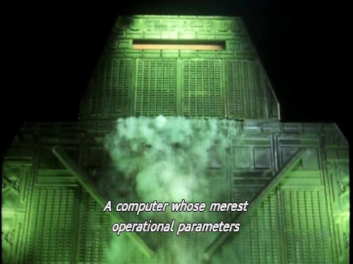 [Priest 1] I think this is getting needlessly messianic. [Computer] A computer whose merest operational parameters [Computer] I am not worthy to calculate, [Computer] but which it will be my destiny eventually to design! [Priest 1] Can we get on and ask the question? [Priest 2] Oh, all right. |