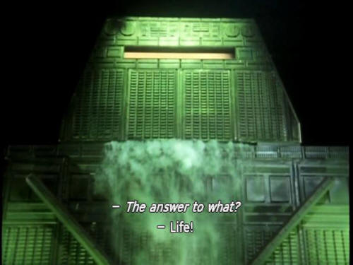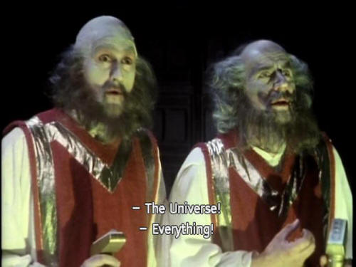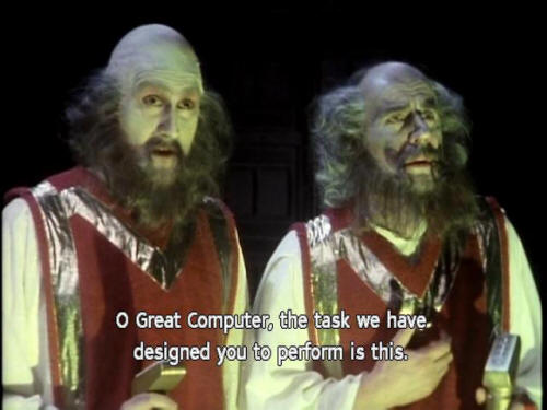 [Priest 1] O Great Computer, the task we have designed you to perform is this. [Priest 1] We want you to tel us the answer. [Computer] The answer? [Computer] The answer to what? [Priest 1] Life! [Priest 2] The Universe! [Priest 1] Everything! [Computer] Tricky. |