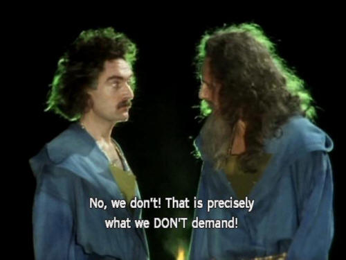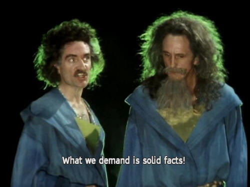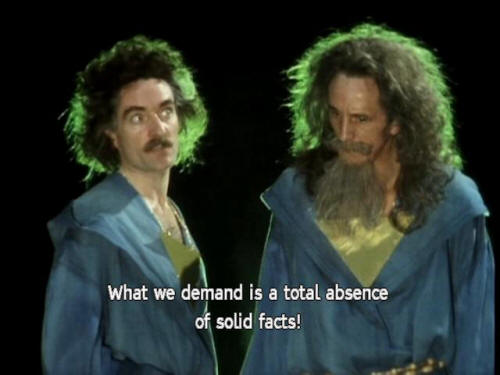 [Vroomfondel] What we demand is solid facts! [Majikthise] No, we don't. That is precisely what we DON'T demand! [Vroomfondel] We don't demand solid facts! [Vroomfondel] What we demand is a total absence of solid facts! [Vroomfondel] I demand that I may, or may not, be Vroomfondel! |
