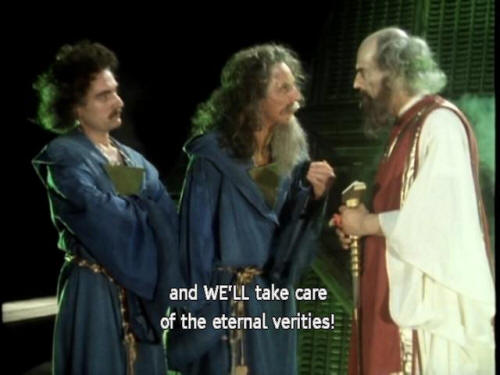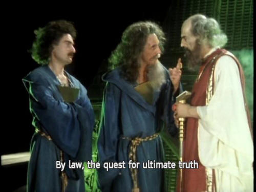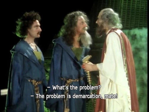[Vroomfondel] We demand that you get rid of it! [Priest 2] What's the problem? [Majikthise] The problem is demarcation, mate! [Vroomfondel] We demand that demarcation may or may not be the problem! [Majikthise] Let the machines get on with the adding up [Majikthise] and WE'LL take care of the eternal verities! [Majikthise] By law, the quest for ultimate truth |