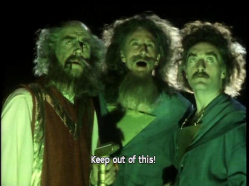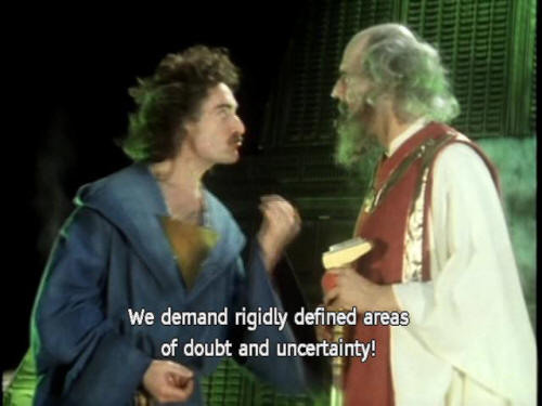 [Vroomfondel] We demand rigidly defined areas of doubt and uncertainty! [Computer] Might I make an observation at this point? [Majikthise] Keep out of this! [Vroomfondel] We demand that that machine not be allowed to think about this problem! (THUNDERCLAP) |