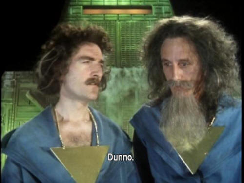 [Computer] you can keep yourselves on the gravy train for life! [Majikthise] Bloody hell! Now, that's what I call thinking! [Majikthise] 'Ere, Vroomfondel, how come we never think of things like that? [Vroomfondel] Dunno [Vroomfondel] I think our minds must be too highly trained, Majikthise. |