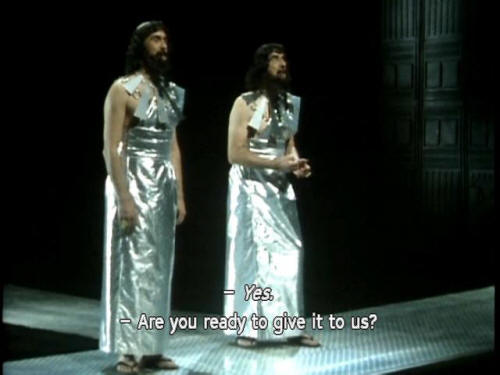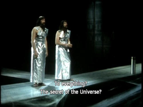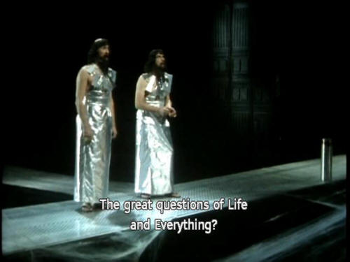 [Priest 1] There really is one? [Deep Thought] There really is one. [Priest] To everything? The secret of the Universe? [Priest 1] The great questions of Life and Everything? [Deep Thought] Yes. [Priest 2] Are you ready to give it to us? [Deep Thought] I am. [Priest 2] Now? |