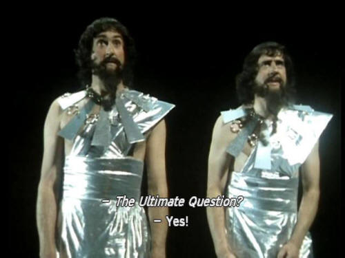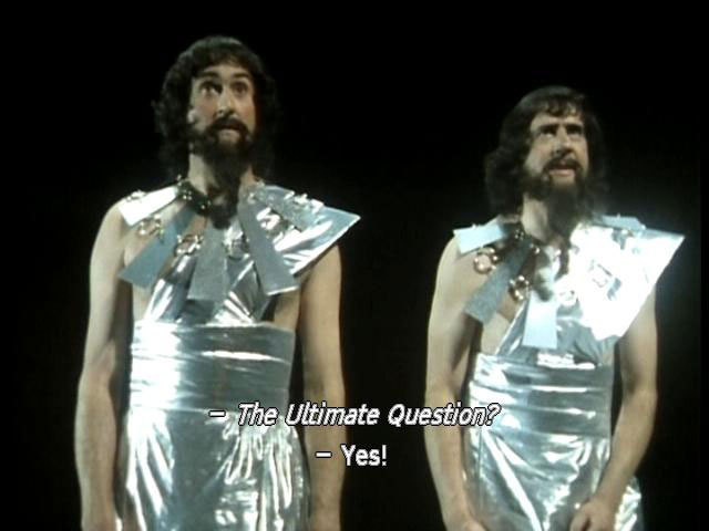[Priest 1] Well, can you please tell us the question? [Deep Thought] The Ultimate Question? [Priest 2] Yes! [Deep Thought] Of Life, the Universe and Everything? [Priest 1] Yes! [Deep Thought] Tricky. [Priest 2] But can you do it? [Deep Thought] No. _______________ Librarian's Comment: "To be, or not to be: that is the question." -- William Shakespeare |
