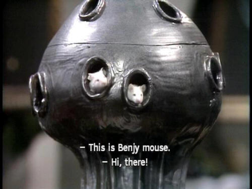 [Arthur] Yes ... sorry. I ... wasn't quite prepared for ... [Trillian] Let me introduce you. [Trillian] This is Benjy mouse. [Benjy] Hi, there! [Trillian] And this is ... Frankie mouse. [Frankie] Pleased to meet you! [Arthur] Aren't they ... [Trillian] The mice I brought from Earth. |
