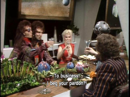 [Benjy] Now to business! [Ford] Oh, yeah. To business! [All] To business! [Benjy] I beg your pardon?! [Ford] I'm sorry, I thought you were proposing a toast! |