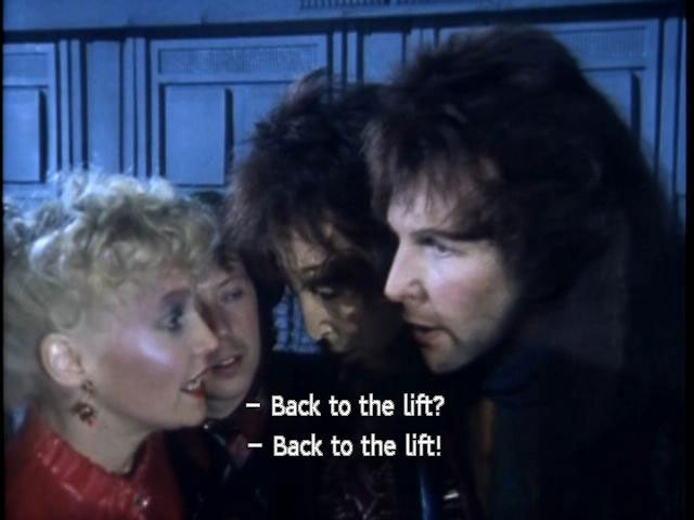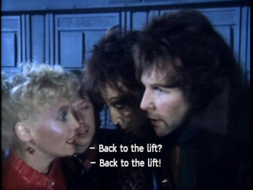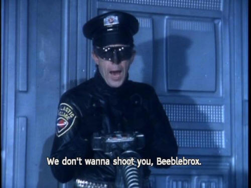 [Ford] Yeah ... this way! [Cop 2] We don't wanna shoot you, Beeblebrox. [Zaphod] Suits me fine! [Trillian] Back to the lift? [Zaphod] Back to the lift! |
