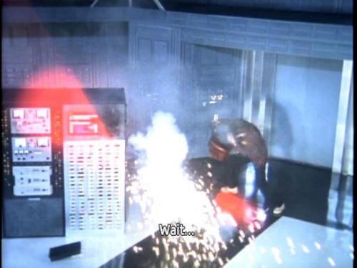 [Ford] Listen ... if we keep them talking, maybe their brains will seize up. [Cop 1] Shall we ... shoot them up again for a while? [Cop 2] Why not? [Cop 1] Yeah. [Ford] Wait ... [Zaphod] Well, that just about wraps it up for this lifetime, I guess. |
