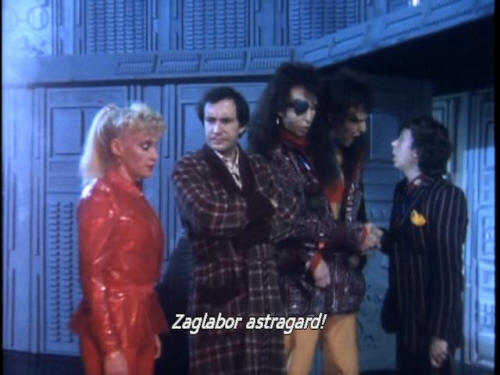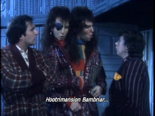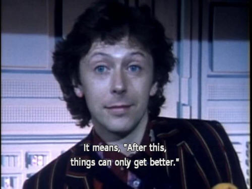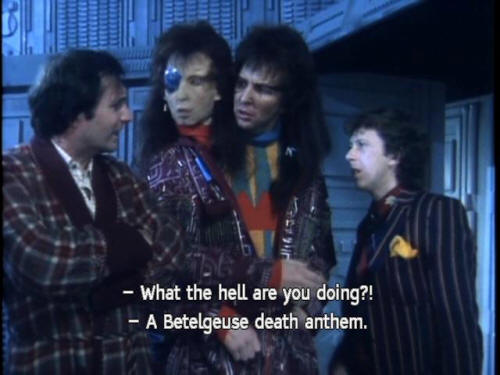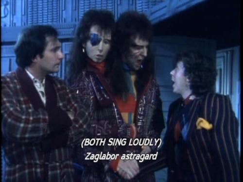 [Ford] Well ... it's really been nice running into you again, Zaphod. [BOTH SING LOUDLY] Zaglabor astragard [Both] Hootrimansion Bambriar ... [Arthur] What the hell are you doing?! [Ford] A Betelgeuse death anthem. [Ford] It means, "After this, things can only get better." [Both] Zaglabor astragard! |