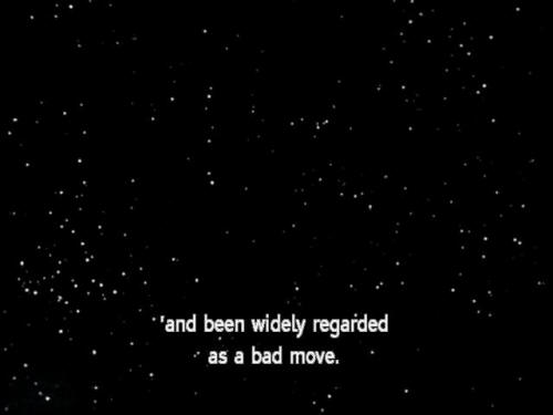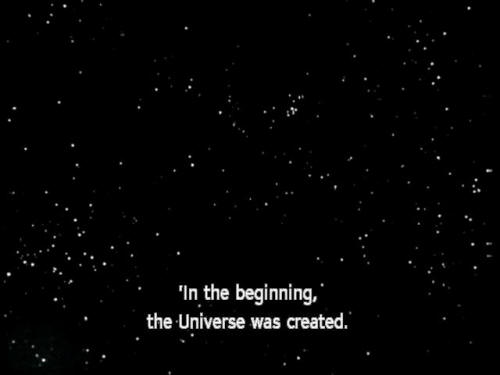 'The story so far. 'In the beginning, the Universe was created. 'This has made a lot of people very angry 'and been widely regarded as a bad move. 'Many races believe that it was created by some sort of god, |