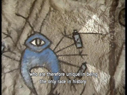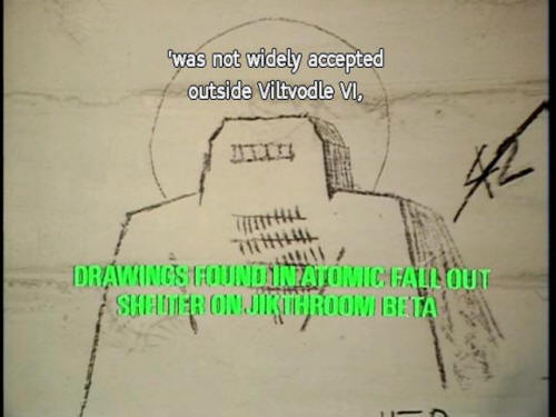 'of the time they call The Coming of the Great White Handkerchief, 'are small blue creatures with more than 50 arms each, 'who are therefore unique in being the only race in history 'to have invented the aerosol deodorant before the wheel. 'However, the Great Green Arkleseizure theory 'was not widely accepted outside Viltvodle VI, DRAWINGS FOUND IN ATOMIC FALL OUT SHELTER ON JIKTHROOM BETA |