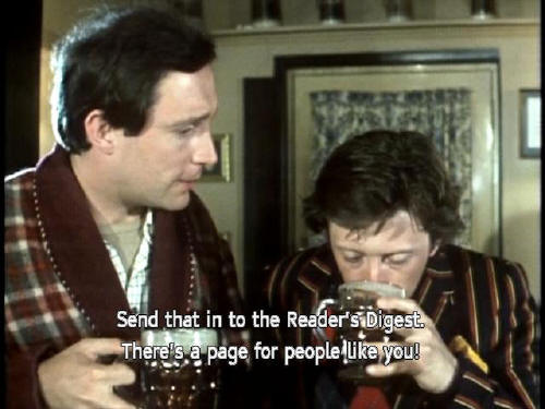 [Arthur] What the hell's going on? I'm losing my grip on the day. [Ford] Drink up. Three pints to go! [Arthur] Three pints? At lunchtime? [Ford] Time is an illusion, lunchtime doubly so. [Arthur] Send that in to the Reader's Digest. There's a page for people like you! |