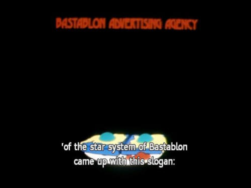 THIS IS OF COURSE IMPOSSIBLE '... which is why the advertising executives 'of the star system of Bastablon came up with this slogan: BASTABLON ADVERTISING AGENCY IF YOU'VE DONE SIX IMPOSSIBLE THINGS THIS MORNING WHY NOT ROUND IT OFF WITH BREAKFAST AT MILLIWAYS, THE RESTAURANT AT THE END OF THE UNIVERSE |