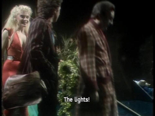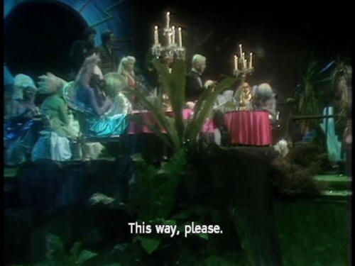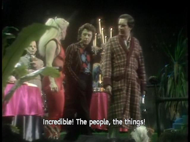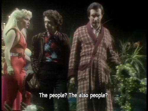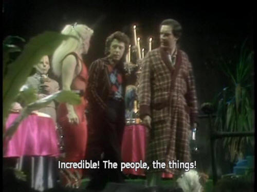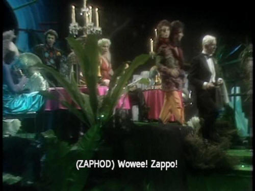 [Waiter] This way, please. [Zaphod] Wowee! Zappo! [Arthur] Incredible! The people, the things! [Ford] The things are also people. [Arthur] The people? The also people? [Trillian] The lights! |