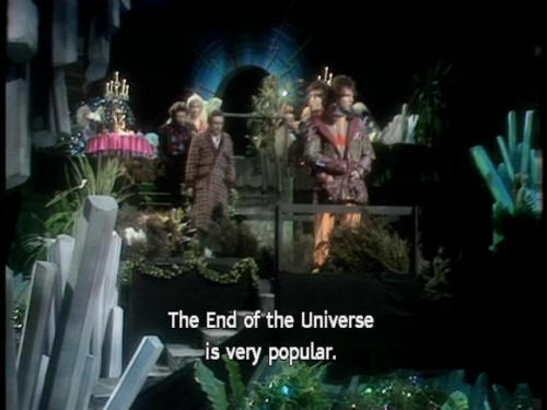[Arthur] The food! [Trillian] The clothes! [Trillian] The clothes?! [Ford] Yeah, the clothes! [Ford] The End of the Universe is very popular. [Ford] People dress up for it. Gives it a sense of occasion. |
