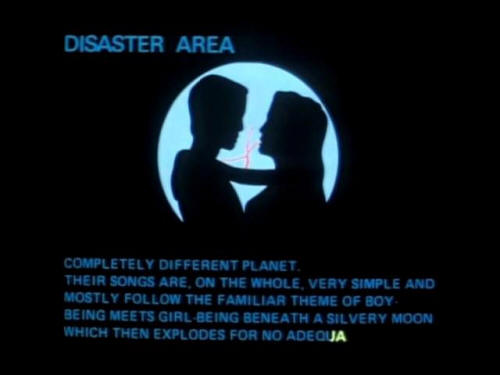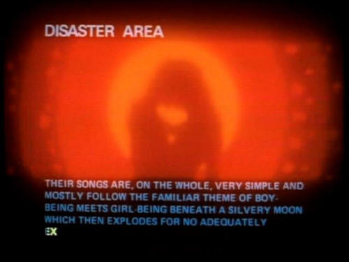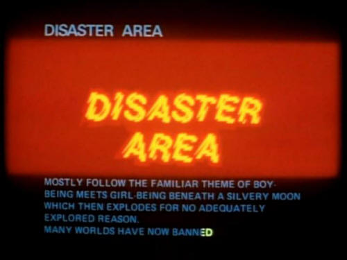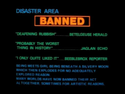 WHICH THEN EXPLODES FOR NO ADEQUATELY EXPLORED REASON. MANY WORLDS HAVE NOW BANNED THEIR ACT ALTOGETHER, SOMETIMES FOR ARTISTIC REASONS DISASTER AREA BANNED. "DEAFENING RUBBISH" -- BETELGEUSE HERALD; "PROBABLY THE WORST THING IN HISTORY" -- JAGLAN ECHO; "I ONLY QUITE LIKED IT" -- BEEBLEBROX REPORTER |