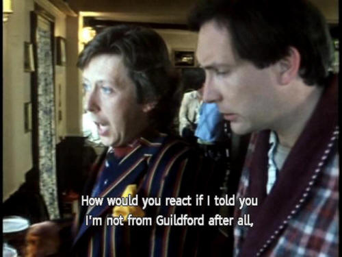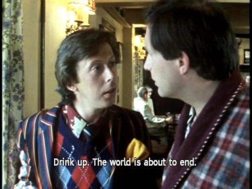 [Ford] How would you react if I told you I'm not from Guildford after all, [Ford] but from a small planet somewhere in the vicinity of Betelgeuse? [Arthur] Why -- do you think it's the sort of thing you're likely to say? [Ford] Drink up. The world is about to end. |