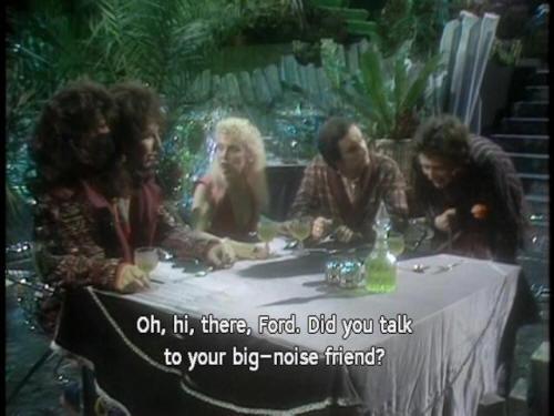 THAT THE WHOLE FABRIC OF THE SPACE TIME CONTINUUM IS NOT MERELY CURVED, IT IS IN FACT TOTALLY BENT. [Zaphod] Oh, hi, there, Ford. Did you talk to your big-noise friend? [Ford] Hot ... Hotblack? Yeah, I sort of spoke to him, yeah. |