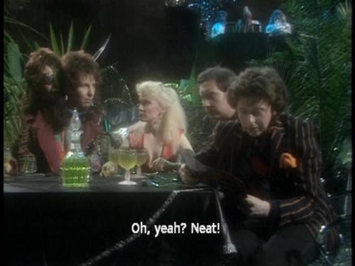[Zaphod] Well, what did he say? [Ford] Er ... not a lot. He's, um ... [Zaphod] Yeah? [Ford] Spending a year dead for tax reasons. [Zaphod] Oh, yeah? Neat! [Host] Good evening, ladies and gentlemen! (APPLAUSE AND CHEERS) |