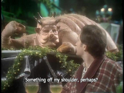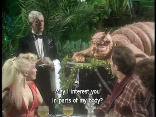 [Dish of the Day] I am the main dish of the day. [Dish of the Day] May I interest you in parts of my body? [Both] Huh? [Ford] Oh, well. [Dish of the Day] Something off my shoulder, perhaps? [Dish of the Day] Braised in a white wine sauce? [Arthur] Your shoulder?! |