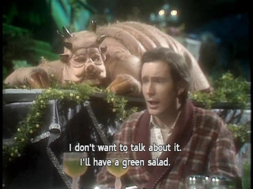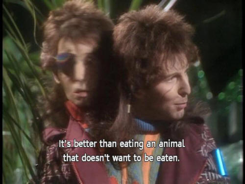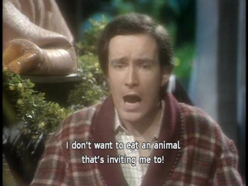 [Arthur] I don't want to eat an animal that's inviting me to! [Zaphod] It's better than eating an animal that doesn't want to be eaten. [Arthur] That's not the point. [Arthur] Well, maybe it is the point. [Arthur] I don't want to talk about it. I'll have a green salad. |