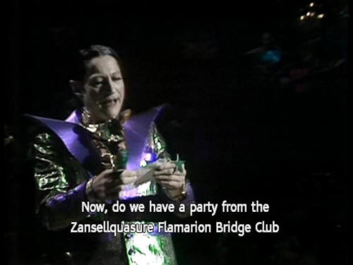 [Host] Now, do we have a party from the Zansellquasure Flamarion Bridge Club [Host] from beyond the Vortvoid of Qvame? (THEY CHEER) [Host] Last bids now, and no cheating! [Host] This is a very solemn moment! [Host] And a party of minor deities |