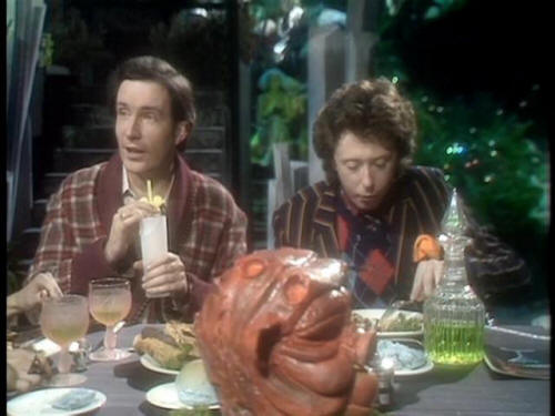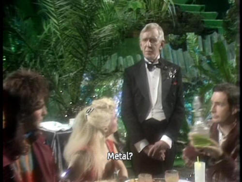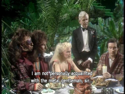 [Zaphod] Who's the cat on the phone? Pass the wine, Ford. [Waiter] I am not personally acquainted with the metal gentleman, sir ... [Trillian] Metal? [Waiter] ... but am informed he has been awaiting your return [Waiter] for a considerable number of millennia. |