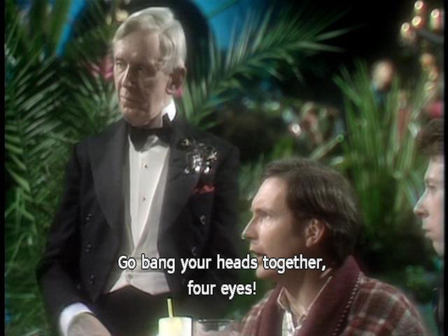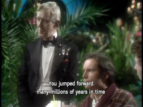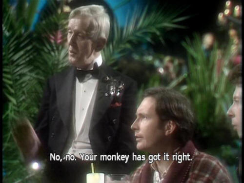[Arthur] Go bang your heads together, four eyes! [Waiter] No, no. Your monkey has got it right. [Waiter] You jumped forward many millions of years in time [Waiter] whilst retaining the same position in space. |