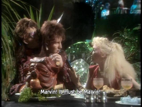 [Waiter] Your friend has been awaiting you in the meantime. [Trillian] Marvin! It must be Marvin! [Ford] The paranoid android! [Zaphod] Space cookies! Hand me the rap rod plate, captain! [Waiter] I beg your pardon, sir? |