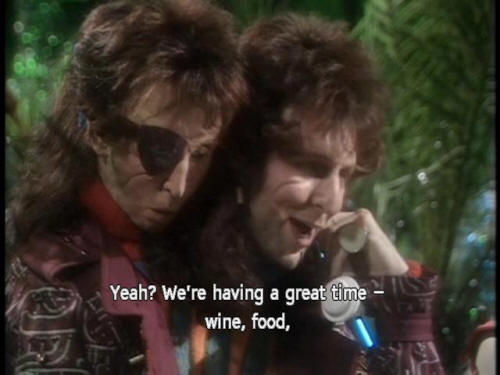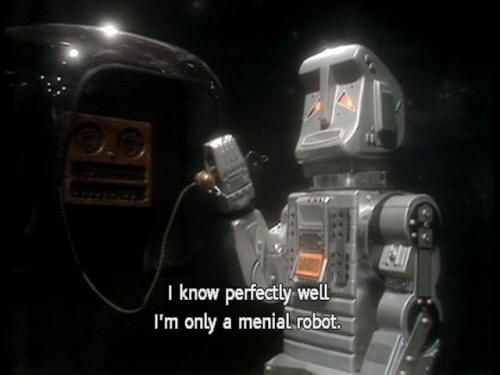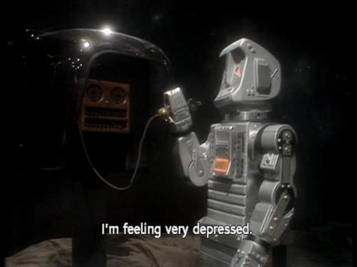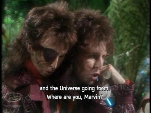 [Marvin] I'm feeling very depressed. [Marvin] Yeah? We're having a great time -- wine, food, [Zaphod] and the Universe going foom! Where are you, Marvin? [Marvin] You don't have to pretend to be interested in me, you know. [Marvin] I know perfectly well I'm only a menial robot. |