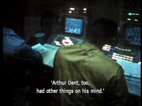 'Arthur Dent, too, had other things on his mind.' (RUMBLING) What's that? [Ford] They haven't started yet. [Arthur] Good. [Ford] Probably your house. [Arthur] What? |