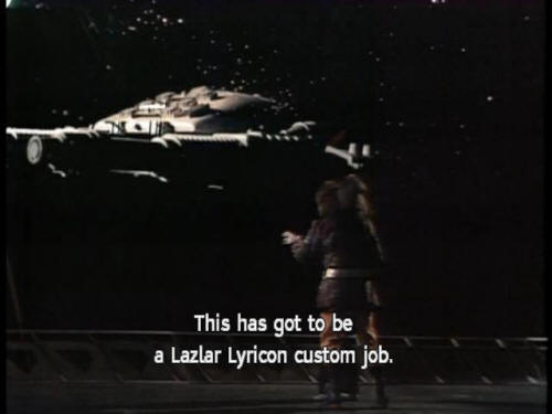 [Zaphod] Hey, get this number. [Zaphod] Multicluster Quark drive with perspulax running boards! [Zaphod] This has got to be a Lazlar Lyricon custom job. [Ford] I was passed by one of these mothers out by the Axel Nebula. [Ford] I was going flat out and this thing just strolled past me! |