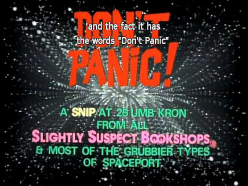 'One of the major selling points 'of that whollly remarkable book THE HITCHHIKERS GUIDE TO THE GALAXY 'apart from its relative cheapness, 'and the fact it has the words "Don't Panic" A SNIP AT 26 UMB KRON FROM ALL SLIGHTLY SUSPECT BOOKSHOPS & MOST OF THE GRUBBIER TYPES OF SPACEPORT |