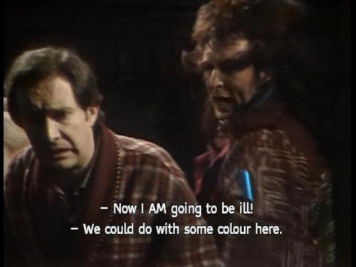 [Ford] Timesick! We're going backwards through time. [Arthur] Now I AM going to be ill! [Zaphod] We could do with some colour here. [Trillian] Oh, that's better! Have you managed to make sense of the controls? [Ford] No. We just stopped fiddling with them. |