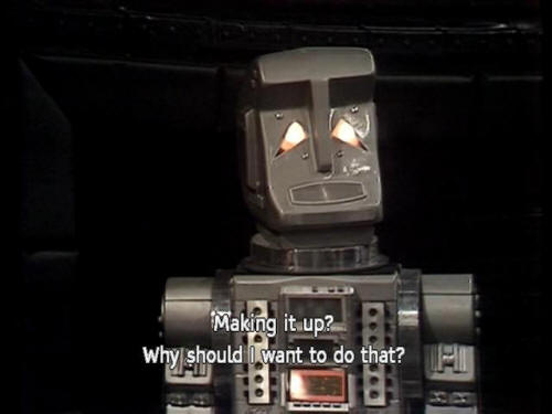 [Marvin] Yes. [Arthur] And? [Marvin] It amazes me how you manage to live in anything that small. [Arthur] Abuse! [Zaphod] Ignore him, he's only making it up. [Marvin] Making it up? Why should I want to do that? |