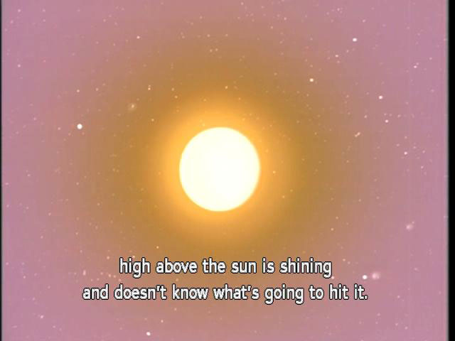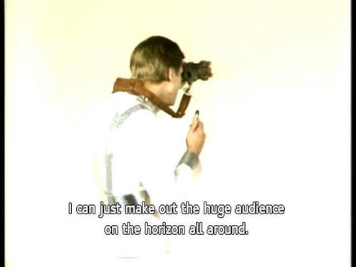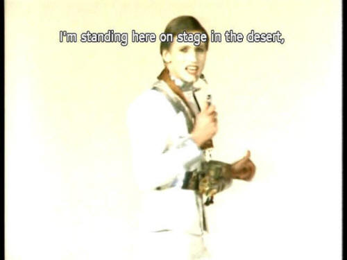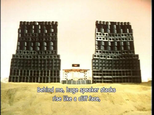 [MC] Fine weather for the concert this afternoon. [MC} I'm standing here on stage in the desert, [MC} and with my hyper-binoctic glasses [MC] I can just make out the huge audience on the horizon all around. [MC] Behind me, huge speaker stacks rise like a cliff face, [MC] high above the sun is shining and doesn't know what's going to hit it. |