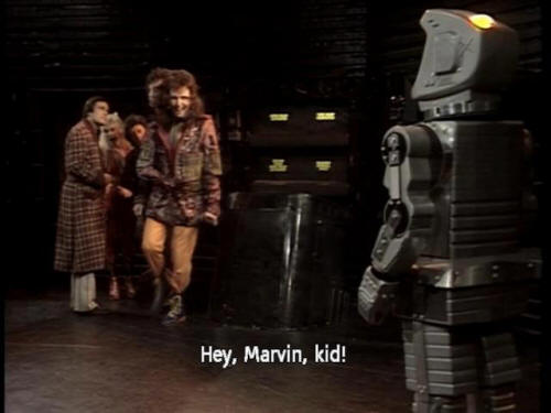 [Zaphod] Who cares? Let's just go! [Ford] Someone has to operate it manually. [Ford] Whoever it was would ... would ... [Trillian] Wouldn't ... [Ford] ... Escape. [Zaphod] Hey, Marvin, kid! |