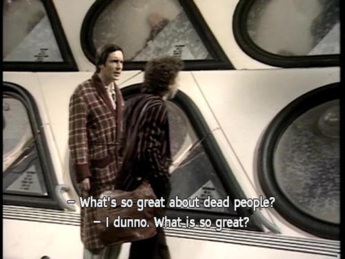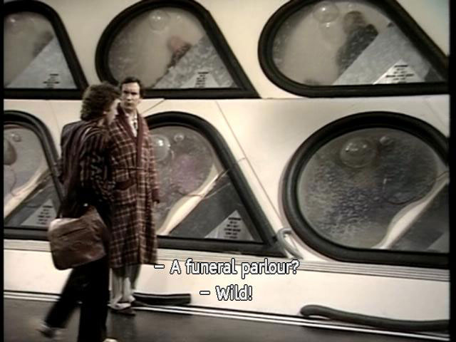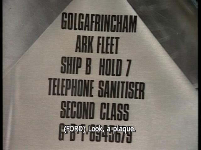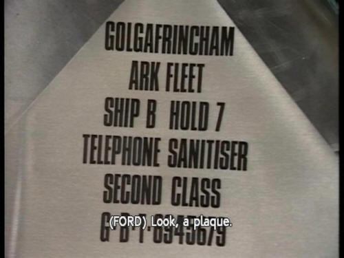 [Arthur] A funeral parlour? [Ford] Wild! [Arthur] What's so great about dead people? [Ford] I dunno. What is so great? [Ford] Look, a plaque. GOLGAFRINCHAM [Ford] And a serial number. |