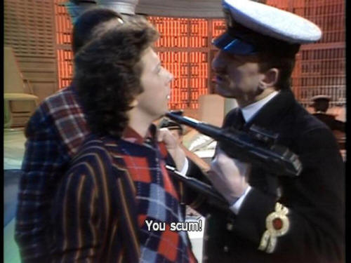 [Captain] Oh, very well. [Captain] Ask them what they want to drink. [Number One] Thank you, sir. [Number One] All right. [Number One] You scum! [Number One] You vermin! [Captain] Steady on, Number One! [Number One] What do you want to drink? |
