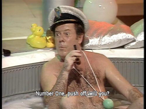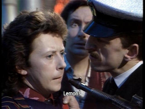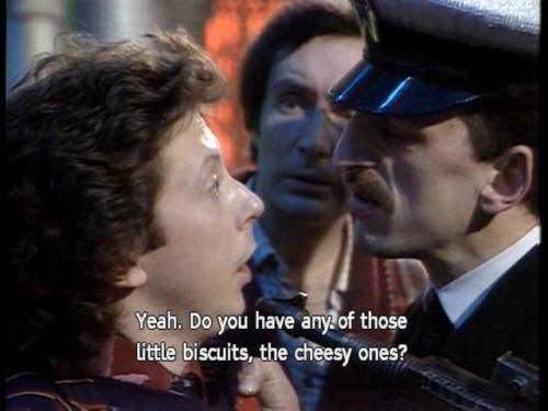 [Number One] Lemon? [Ford] Yeah. Do you have any of those little biscuits, the cheesy ones? [Number One] I'm asking the questions. [Captain] Number One, push off, will you? |