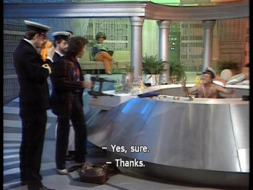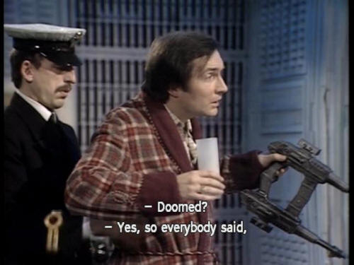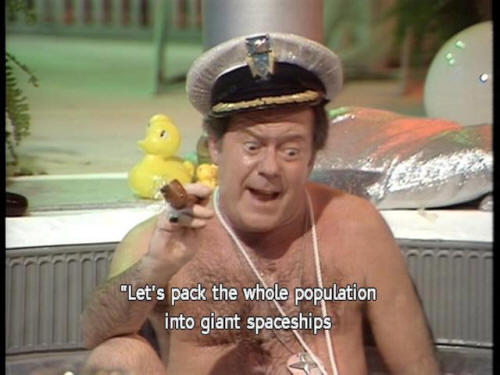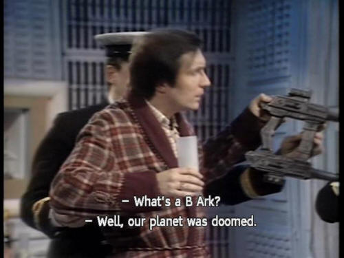 [Ford] Yes, sure. [Captain] Thanks. [Arthur] What's a B Ark? [Captain] Well, our planet was doomed. [Arthur] Doomed? [Captain] Yes, so everybody said, [Captain] "Let's pack the whole population into giant spaceships |