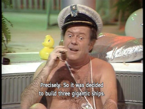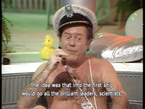 [Captain] "and settle on another planet." [Arthur] A less doomed one? [Captain] Precisely. So it was decided to build three gigantic ships. [Captain] Three gigantic Arks in space. [Captain] The idea was that into the first ship would go all the brilliant leaders, scientists, [Captain] the great artists, you know, all the achievers. |