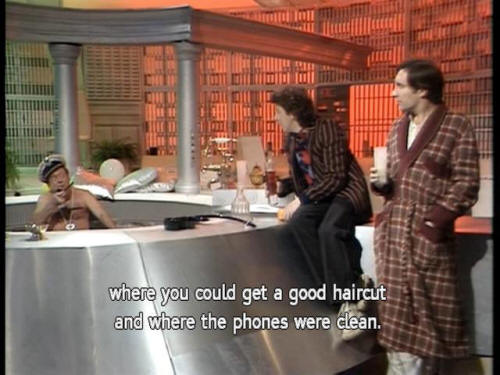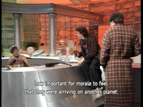 [Ford] Really? [Number One] Yes. [Number One] He said how lucky I was to be going off in the first ship. [Arthur] But they made sure they sent all you lot off first, anyway. [Captain] Oh, yes! And everyone said -- very nice I thought -- [Captain] how important for morale to feel that they were arriving on another planet [Captain] where you could get a good haircut and where the phones were clean. |