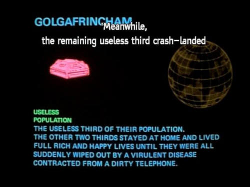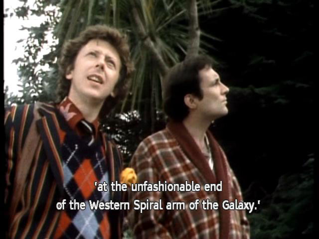 'Meanwhile, the remaining useless third crash-landed 'into the prehistoric dawn of a small blue-green planet 'at the unfashionable end of the Western Spiral arm of the Galaxy.' [Ford] It's odd, isn't it? 'With them are Arthur Dent and Ford Prefect. |