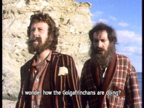 [Arthur] I can hardly believe it. [Ford] I find it very easy to believe things. [Arthur] I wonder how the Golgafrinchans are doing? [Ford] Do you? (IDLE CHATTERING) |