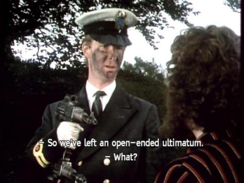 [Number Two] Yes. But there will be one day. [Number Two] So we've left an open-ended ultimatum. [Ford] What? [Number Two] And blown up a few military installations. [Captain] Military installations, Number Two? [Number Two] Yes, sir. [Number Two] Well, potential military installations. [Number Two] All right, trees. |
