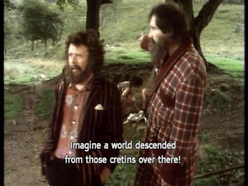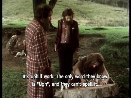 [Arthur] It's uphill work. The only word they know is "Ugh," and they can't spell it. [Ford] What's the point in that? [Arthur] To make them evolve. [Arthur] Imagine a world descended from those cretins over there! [Ford] We don't have to, we've seen it. [Arthur] But honestly! [Ford] We've seen it. There's no escape. [Arthur] Did you tell them what we discovered? [Ford] What? |